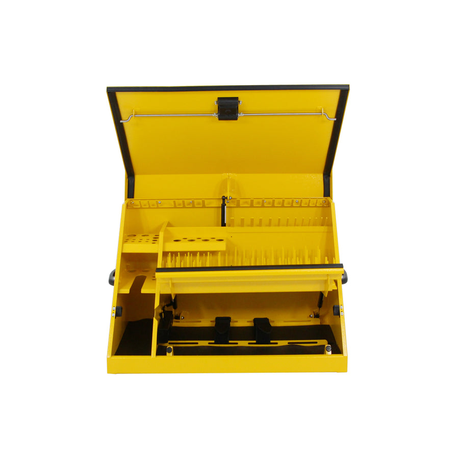 Introducing the DeWalt 30 x 15 in. Triangle in all Yellow. This multi-tier design toolbox is designed to hold larger tools and supplies while keeping them organized and in one place. This durable and reliable triangle has features, such as full height socket pegs for more flexibility to organize your sockets, tool platforms for storage of ratchets, exertions and screwdrivers, wrench pegs for spacing of ratcheting wrenches and much more. The 3 outlet power strip with 2 USB ports provides reliable charging of your tools. There is also a slot to store your driver with or without a battery. Constructed of steel with a yellow finish, this triangle makes for a great storage unit for any job. It is designed to carry both SAE and Metric tools, and the weather seal prevents any moisture or dust from getting in your Triangle. Keep unwanted hands away from your tools with the locking latch on the lid.